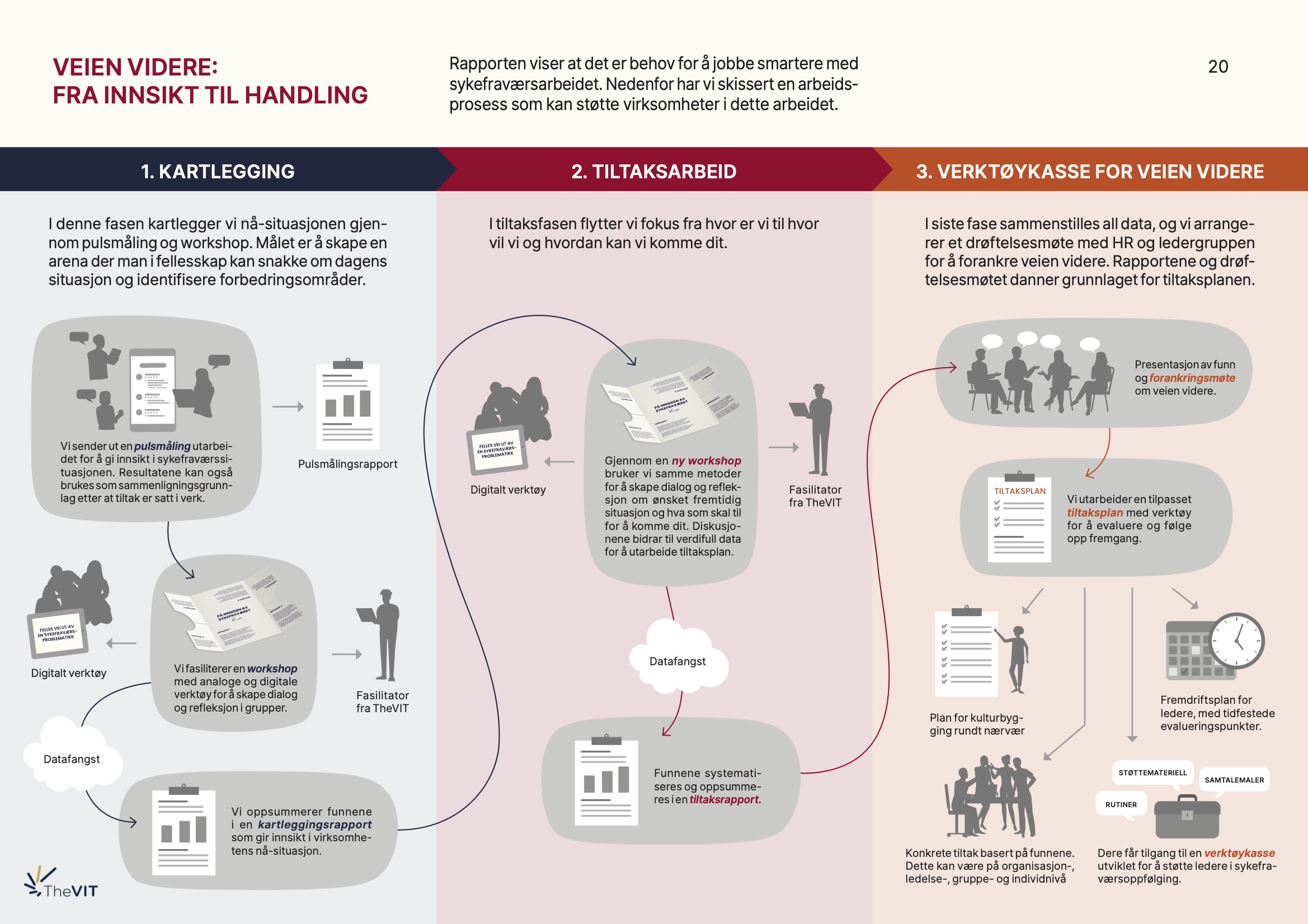 Arbeidet tar utgangspunkt i sykefraværsrapporten «På innsiden av sykefraværet«, utarbeidet av TheVIT. Rapporten identifiserer sentrale faktorer som kjennetegner virksomheter som lykkes med å redusere sykefravær, blant annet tydelige roller, smarte strukturer og ledere som har støtte til å jobbe systematisk med sykefravær.